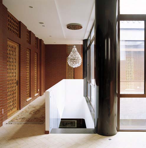 門廳工整考究,打開大門,迎面是傳統的灰磚與玲瓏剔透的玻璃磚形成的玄關。